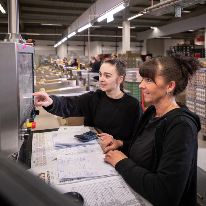 Mehr als 40 Beschäftigte sortieren täglich zwischen 350.000 und 450.000 Eier in einer umfangreichen Produktpalette. Ihr tägliches Bemühen um eine hohe Qualität ist ein wesentlicher Bestandteil der Unternehmenskultur.